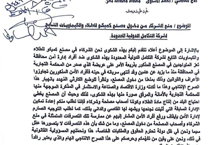 وفي هذا الملف ستكتشف أن محافظ محافظة تعز – الحوبان بات عاجزًا عن السيطرة على مدير الأمن، إذ إن العميد شكري نعمان – بحسب ما لدينا من وثائق – لا يُعير توجيهات المحافظ أحمد المساوى أدنى اهتمام، ويصرّ على استمرار مسلسل ابتزازه لمصنع الطلاء كميكو، حيث يفرض على إدارة المصنع صرف مستحقات جنوده الذين كلفهم بحراسة المصنع منذ ما يقارب ثلاث سنوات، بحجة أنّ لديه أمرًا من المحكمة التجارية في تعز. وقد صدر ذلك الأمر عام 2022 بطلب من المرحوم أحمد عبدالله الشيباني آنذاك.