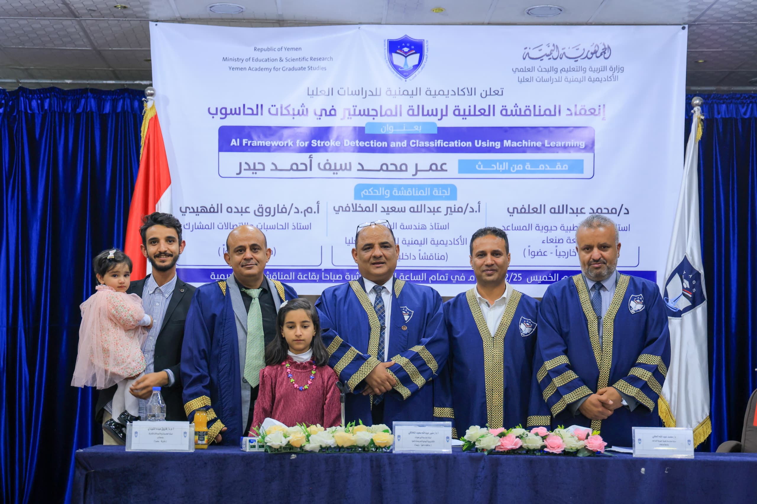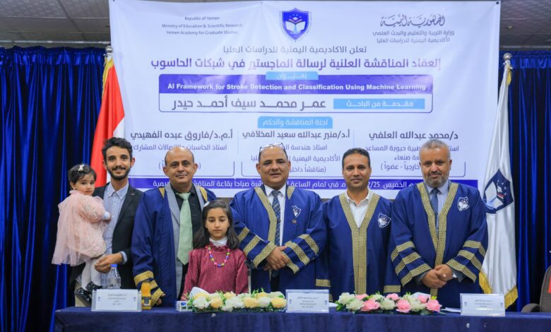 حصل الباحث المهندس/ عمر محمد سيف احمد حيدر على درجة الماجستير بامتياز من الأكاديمية اليمنية للدراسات العليا في شبكات الحاسوب عن رسالته الموسومة ” استخدام تقنيات الذكاء الصناعي في تشخيص الجلطات الدماغية”.